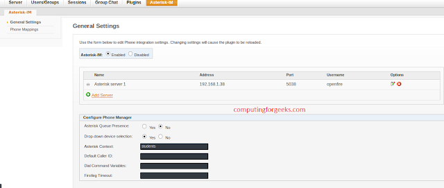 > Now it's time to add Asterisk Server. This is done by just clicking on "Add Server" option under General settings.Then provide the following information